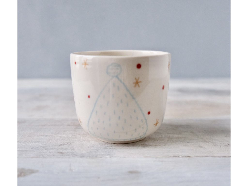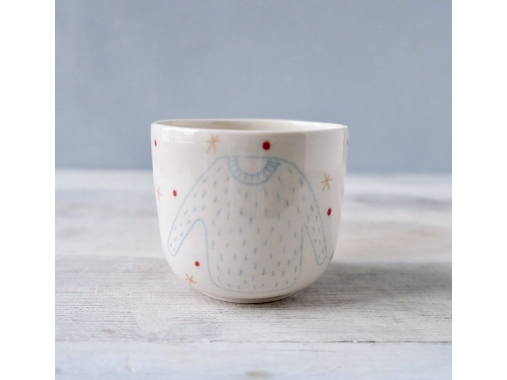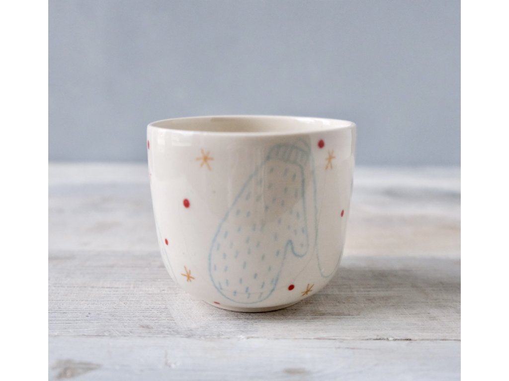 Na hrnčířském kruhu točený, poté ručně dekorovaný pohárek. Ideální na kávičku.