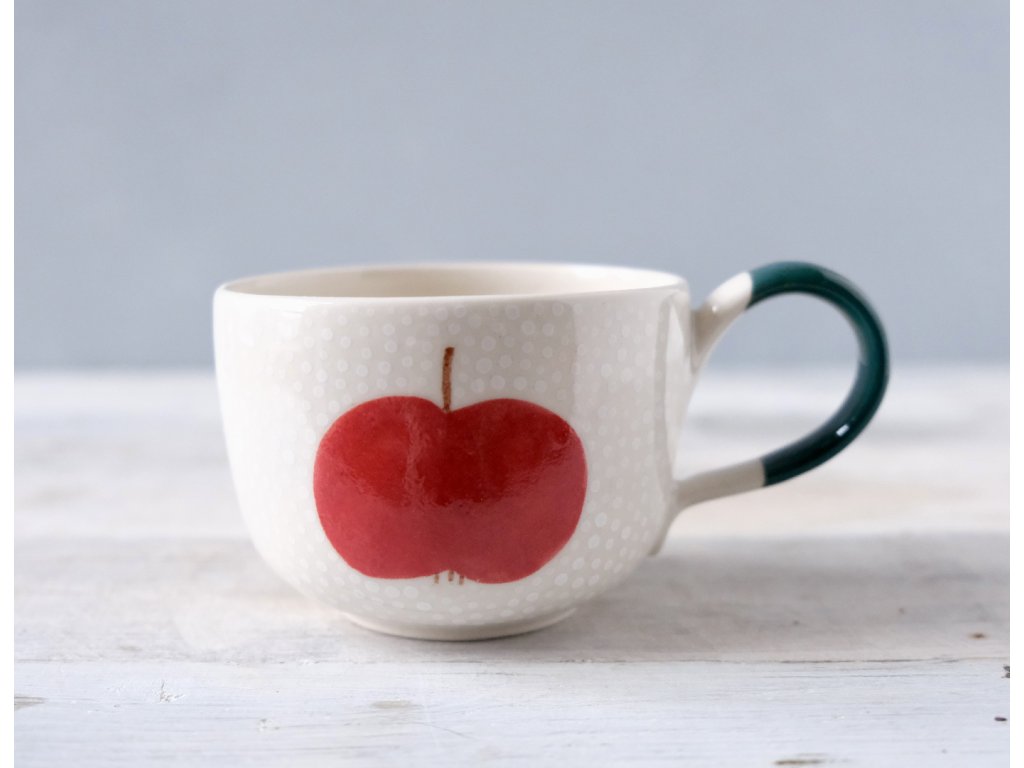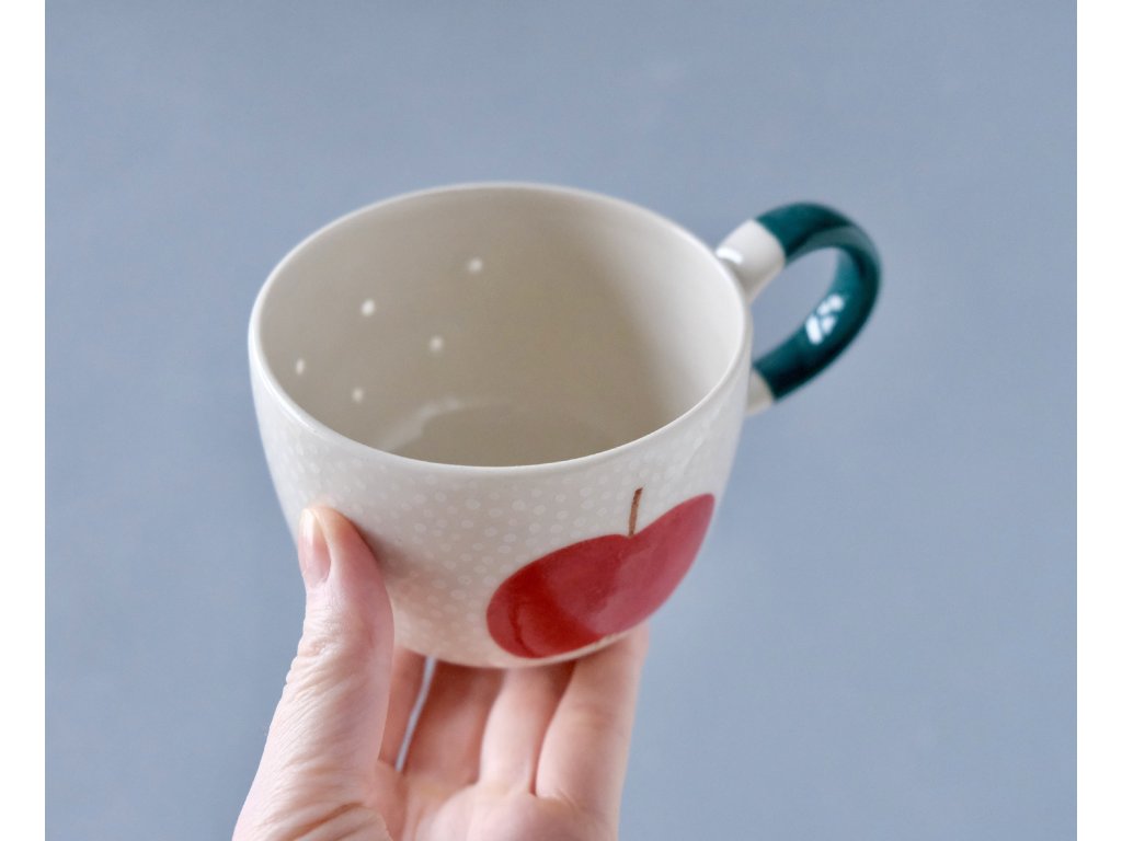 Hrneček vytočený na kruhu, poté ručně dekorovaný s průsvitnými tečkami. Někomu by se mohl zdát děravý, a přesto by žádnou pohromu nedopustil. Vrstva glazury klame svým vzhledem, a nepropustí ani kapku. Pro dosažení cíleného efektu se musí glazování několikrát opakovat.