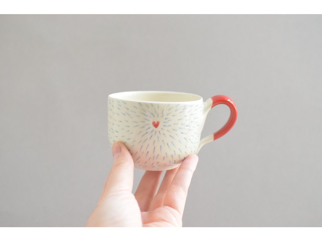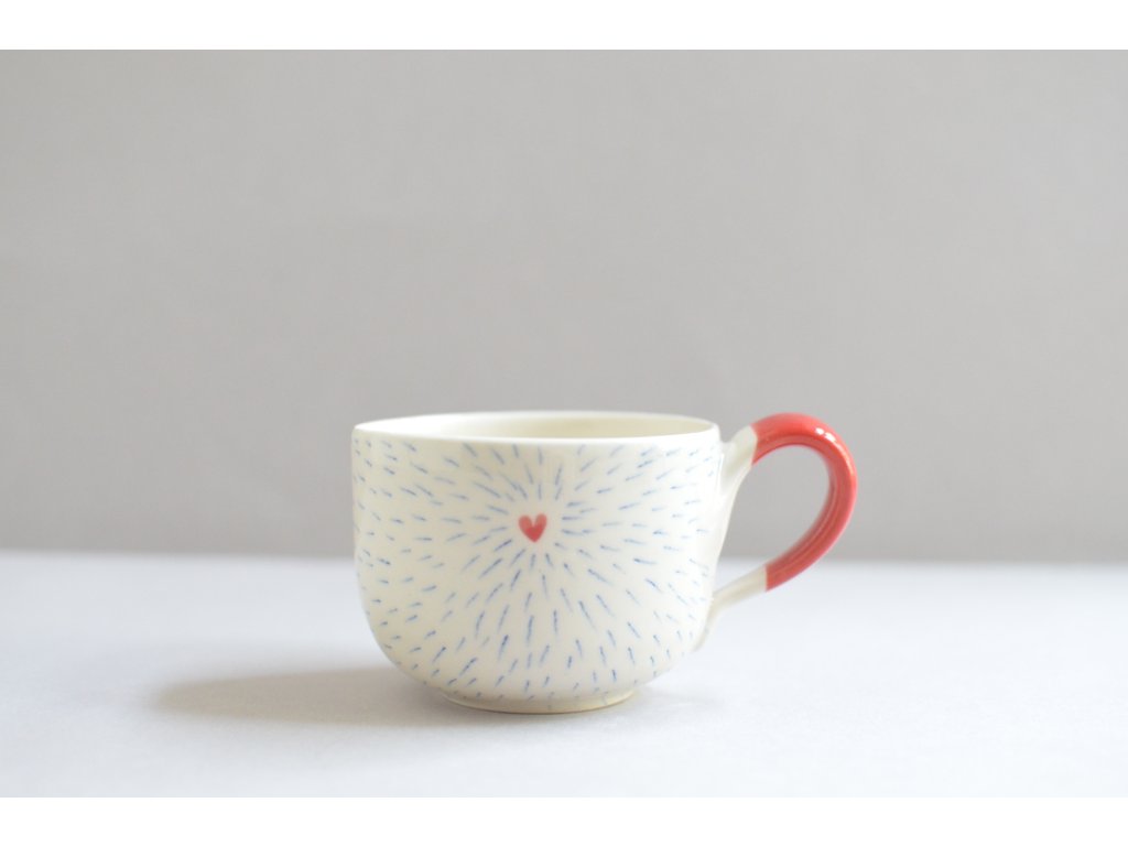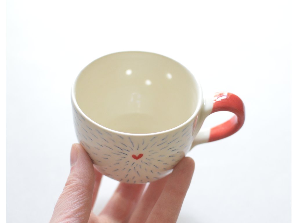 Červenomodrý hrnek se srdíčkem a průsvity pro lepší náladu. Prosvítání v hrnku vám zpříjemní chvilky s čajem či kávou. Někomu by se mohl zdát děravý, a přesto by žádnou pohromu nedopustil. Vrstva glazury klame svým vzhledem, a nepropustí ani kapku. Pro dosažení cíleného efektu se musí glazování několikrát opakovat.
