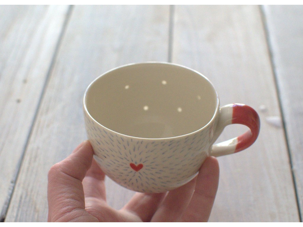 Červenomodrý hrnek se srdíčkem a průsvity pro lepší náladu. Prosvítání v hrnku vám zpříjemní chvilky s čajem či kávou. Někomu by se mohl zdát děravý, a přesto by žádnou pohromu nedopustil. Vrstva glazury klame svým vzhledem, a nepropustí ani kapku. Pro dosažení cíleného efektu se musí glazování několikrát opakovat.