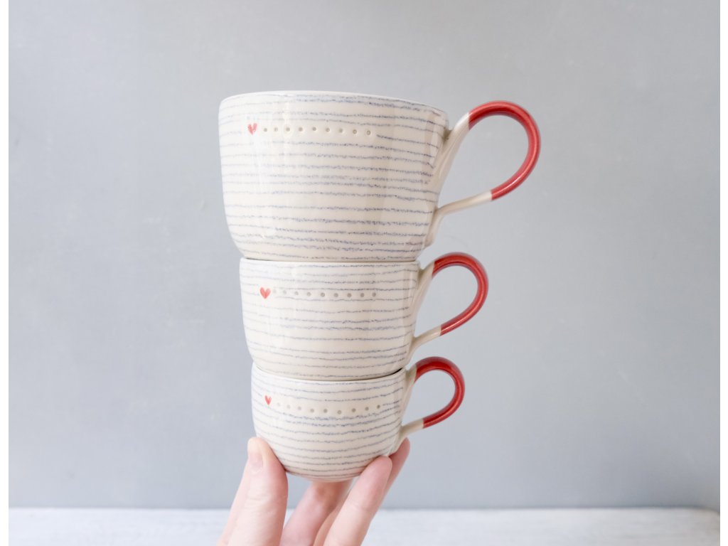 Naše hrnky už jsou za ta léta vychytané. Díky tenkému střepu jsou lehké, díky dobře tvarovanému uchu se výborně drží a díky hutnému materiálu jsou odolné vůči oťukávání.
