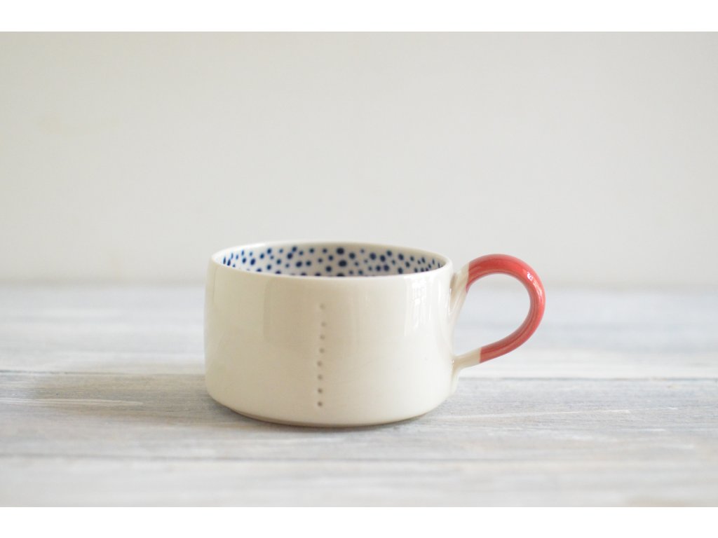 Na hrnčířském kruhu točený, poté ručně dekorovaný hrneček.
