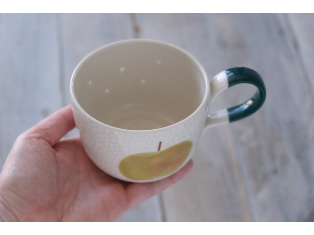 Hrneček vytočený na kruhu, poté ručně dekorovaný s průsvitnými tečkami. Někomu by se mohl zdát děravý, a přesto by žádnou pohromu nedopustil. Vrstva glazury klame svým vzhledem, a nepropustí ani kapku. Pro dosažení cíleného efektu se musí glazování několikrát opakovat.