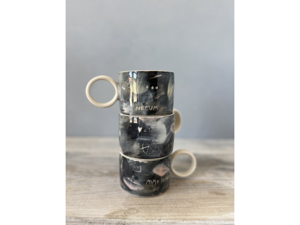 Na hrnčířském kruhu točený, poté ručně malovaný hrneček.
