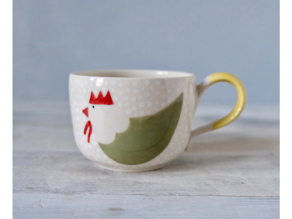 Na hrnčířském kruhu točený, poté ručně malovaný hrneček.