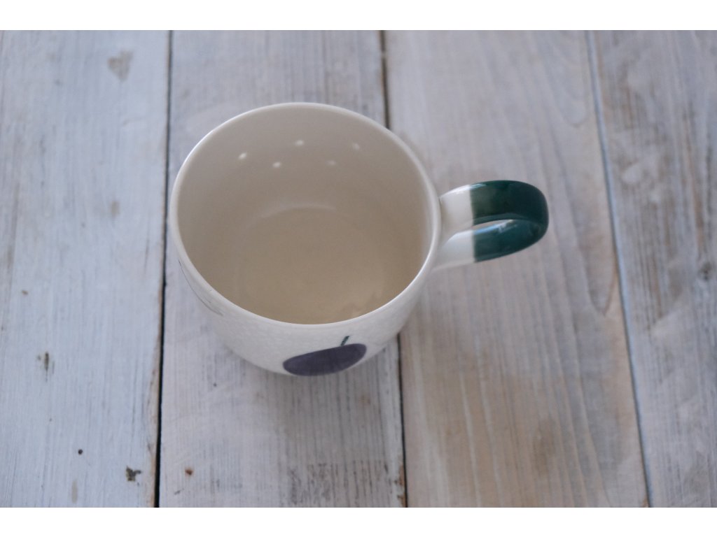 Hrneček vytočený na kruhu, poté ručně dekorovaný s průsvitnými tečkami. Někomu by se mohl zdát děravý, a přesto by žádnou pohromu nedopustil. Vrstva glazury klame svým vzhledem, a nepropustí ani kapku. Pro dosažení cíleného efektu se musí glazování několikrát opakovat.